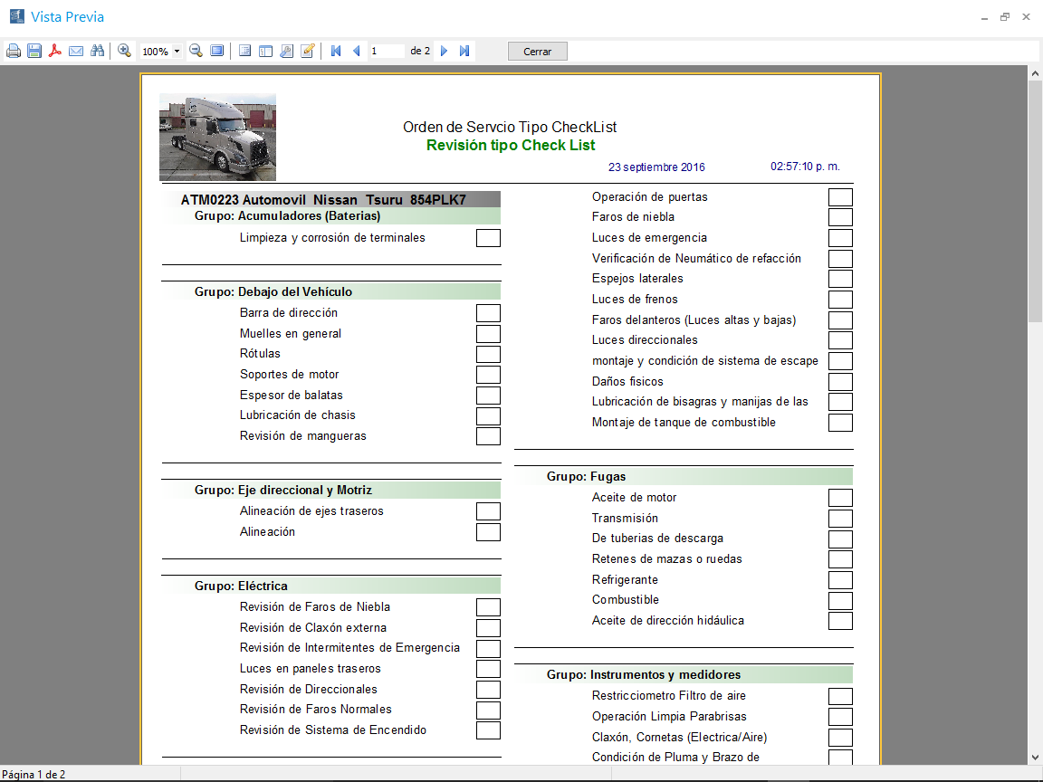 Al dar clic en imprimir, nos muestra la siguiente ventana con la vista previa de la hoja u hojas de las Tareas de CheckList como se muestra en la siguiente imagen.