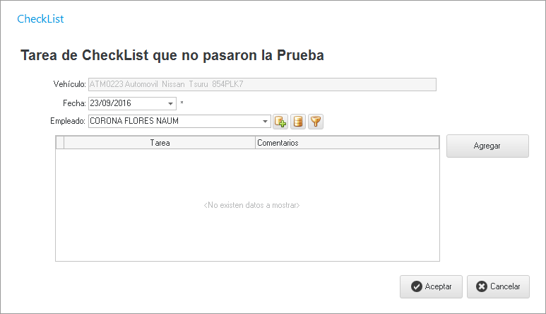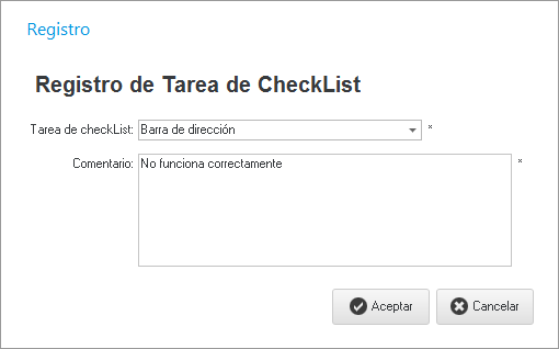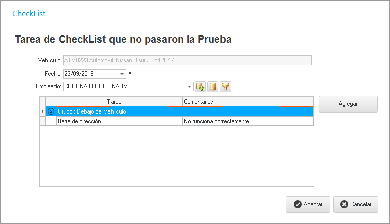 Posteriormente daremos clic en el botón Agregar, el cual nos muestra la siguiente ventana en donde seleccionaremos la tarea de CheckList que no superó las pruebas realizadas y un comentario indicando el problema encontrado durante la revisión.