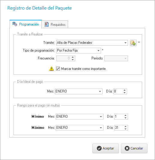 Al hacer clic nos muestra la siguiente ventana en donde definiremos el trámite, el tipo de programación que pueden ser los siguientes: