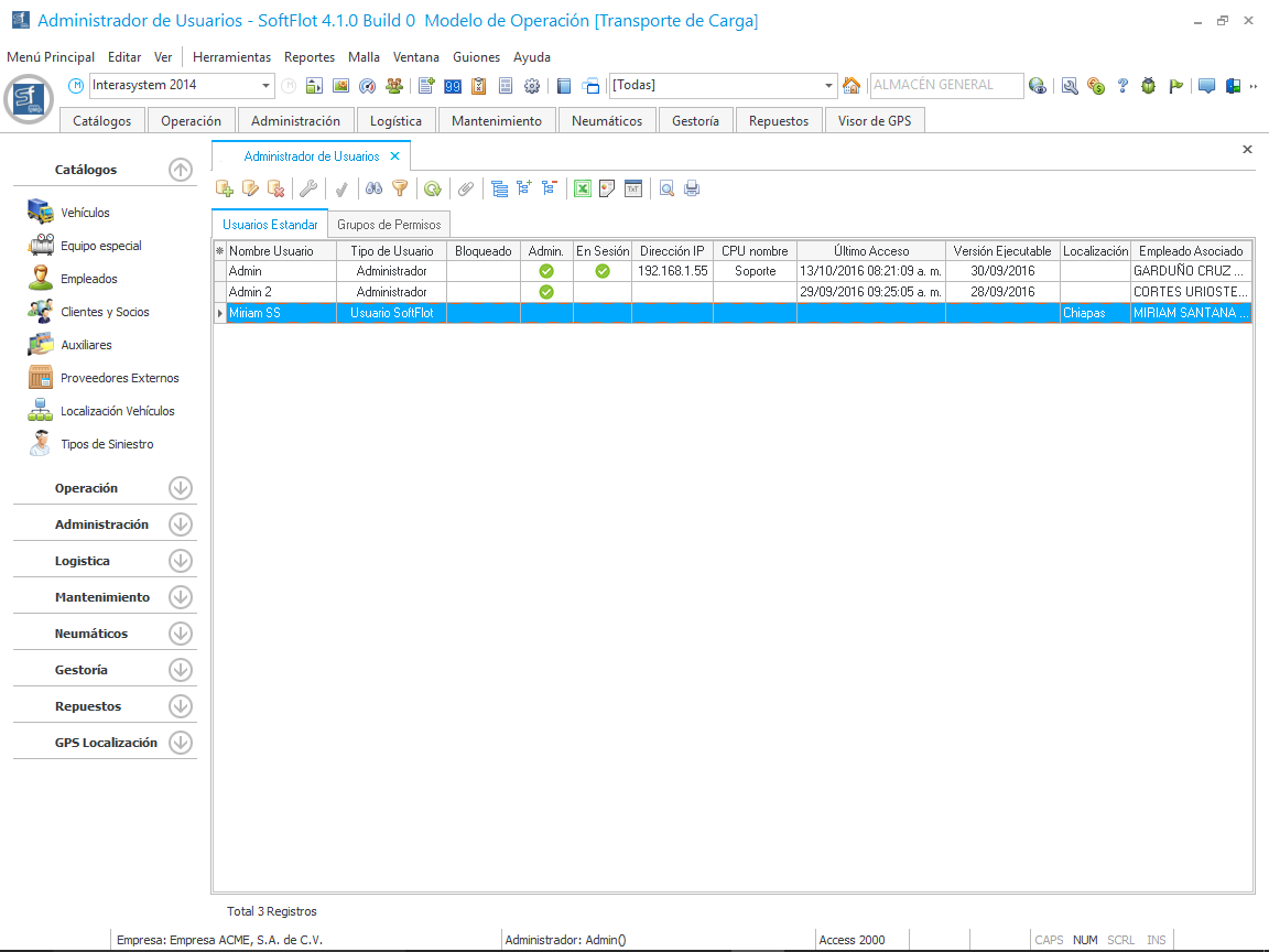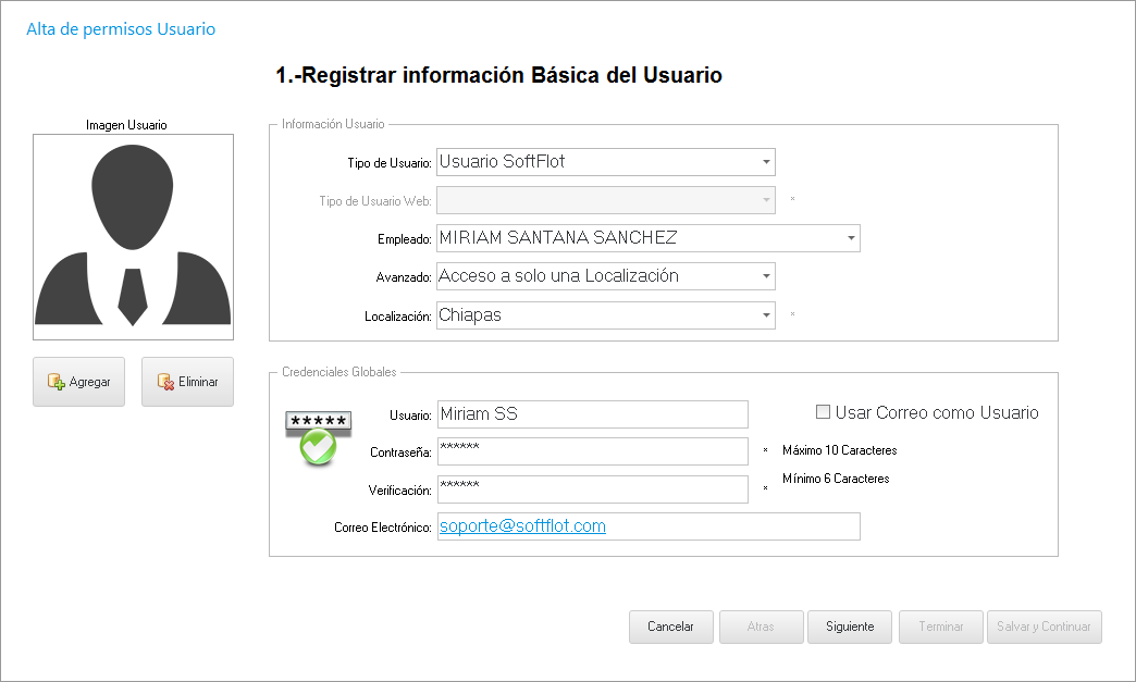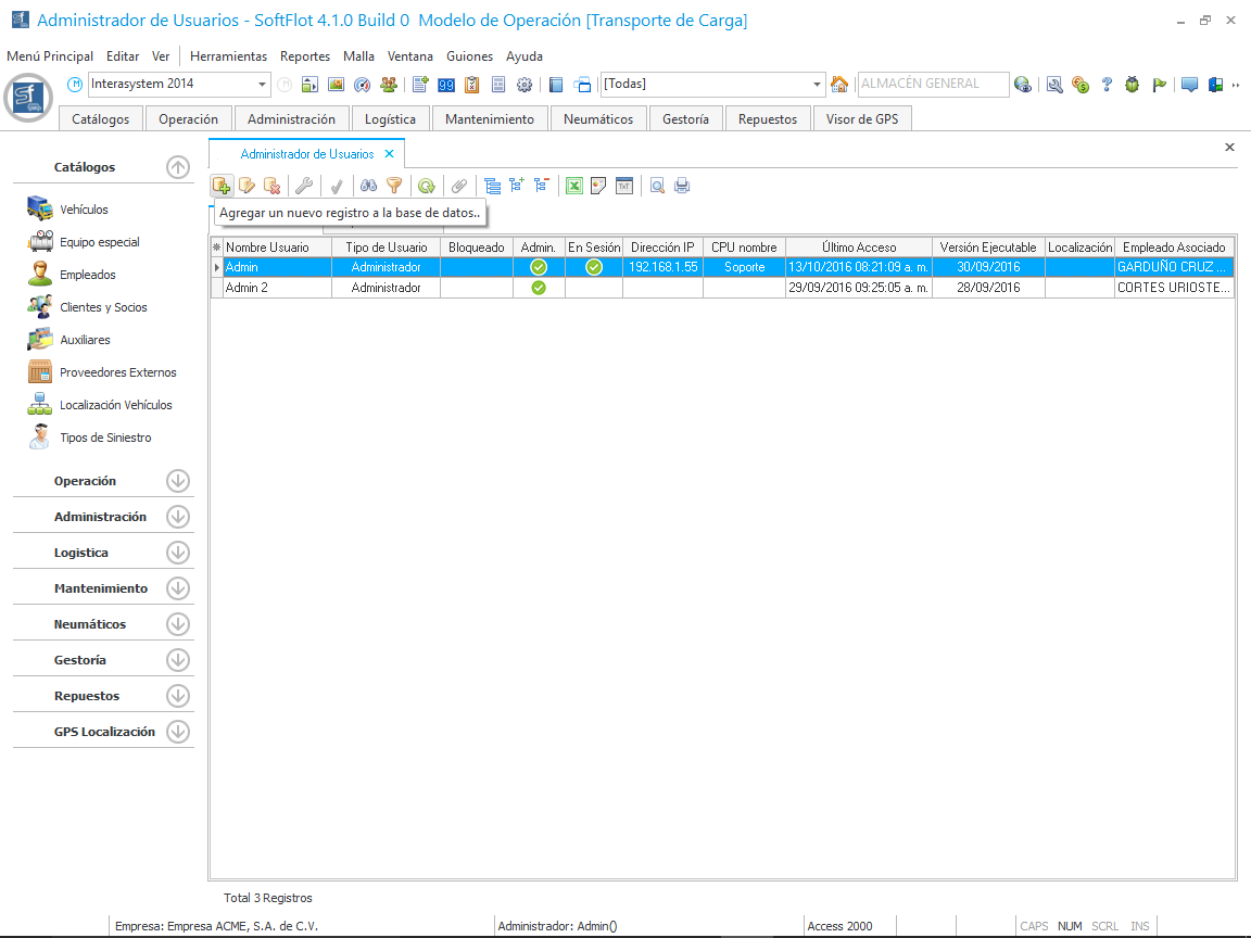 - Tipo de Usuario; Estos pueden ser: Administrador, Usuario SoftFlot y Usuario ToolWeb (requiere el complemento).