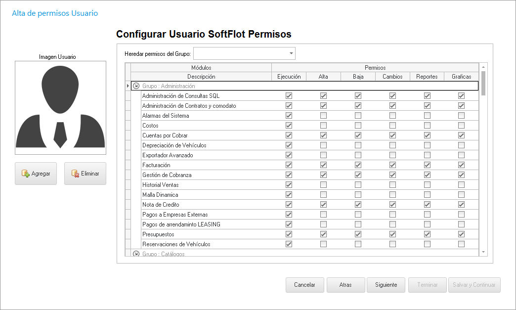 Al hacer clic en Siguiente, nos muestra la siguiente ventana en la cual podemos decidir los permisos del usuario para poder, ver, generar, eliminar, modificar información en la base de datos, o seleccionar el Grupo de permisos; además de poder generar reportes y gráficas. Estos permisos se otorgan de manera general por módulo y no por acción específica de cada módulo.