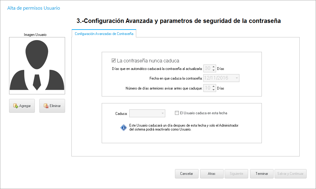 Al hacer clic en Siguiente, abre esta ventana en donde decidimos si la contraseña o el usuario mismo tiene un tiempo de caducidad.