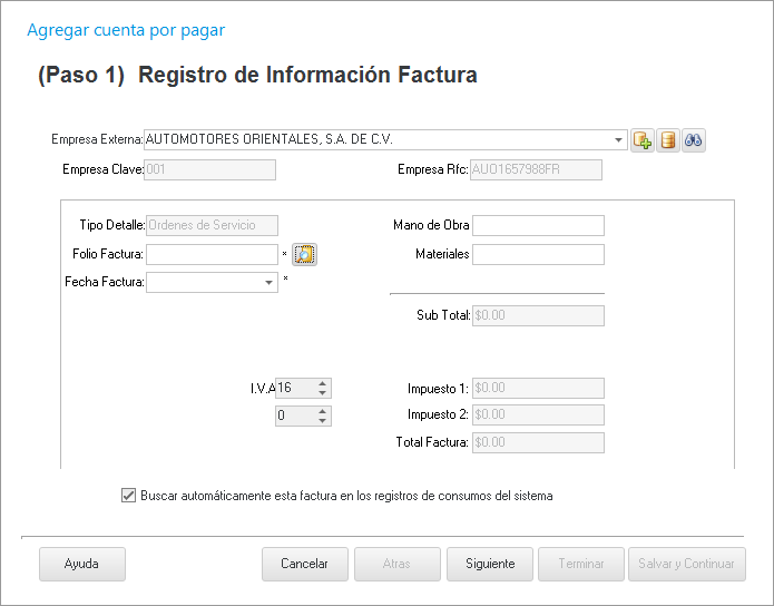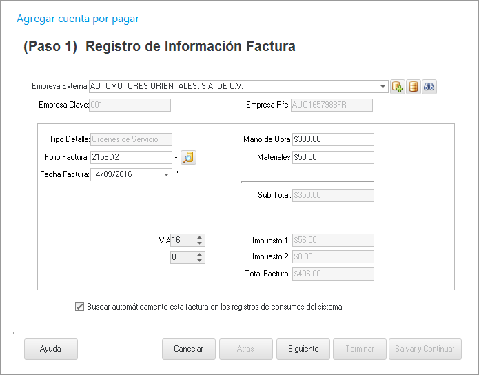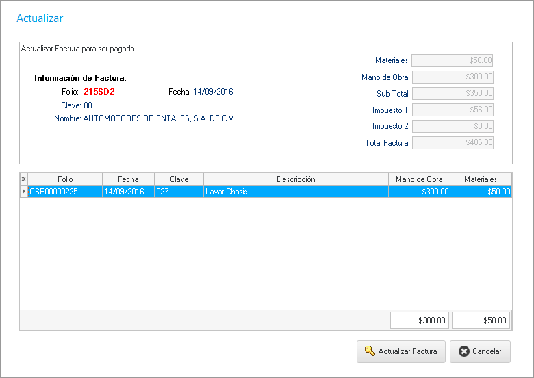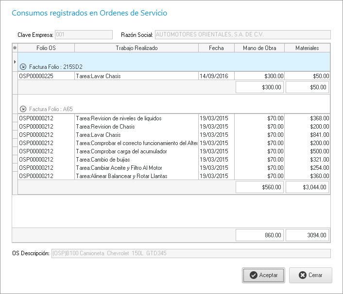 Después, en la ventana anterior, agregaremos los costos de Mano de Obra y Materiales de acuerdo a la OS y el impuesto de I.V.A, si este lleva, y la fecha de factura.