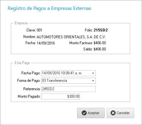 Al dar clic nos mostrará la siguiente ventana en donde ingresaremos la fecha y forma de pago, referencia y un monto de pago