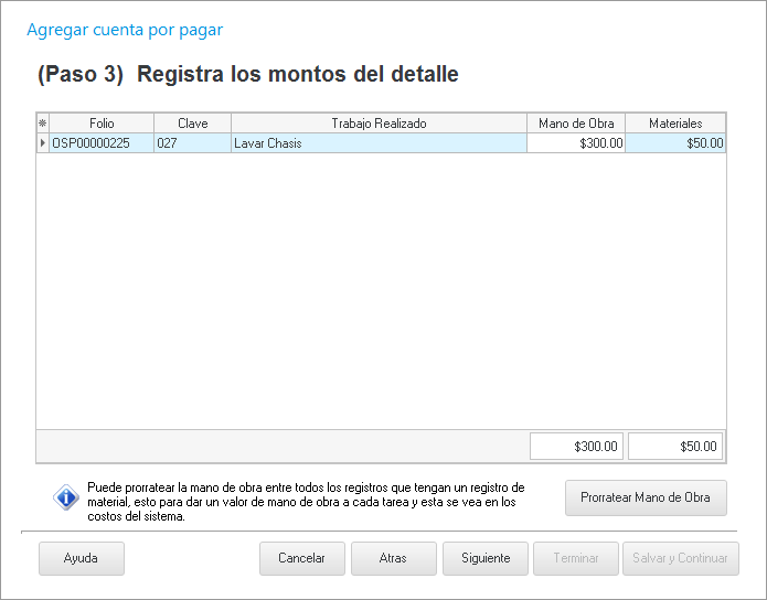 Damos clic en Siguiente y nos abrirá una ventana en donde registraremos los montos de las tareas realizadas en las OS.