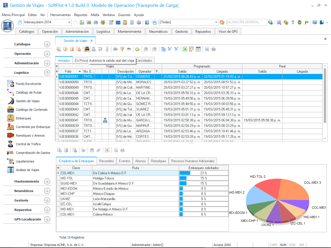 Al dar clic en Si, el viaje pasa al estado de "En proceso", de esta manera se da salida a un viaje armado.
