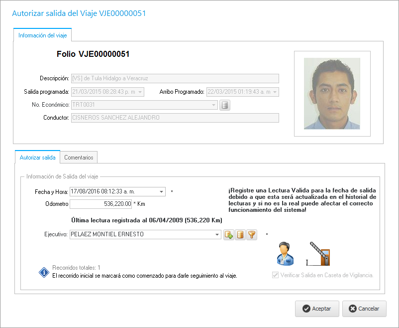 Al dar clic nos abrirá la siguiente ventana en la cual ingresamos la lectura del medidor del vehículo y el ejecutivo quien autorizó la salida.