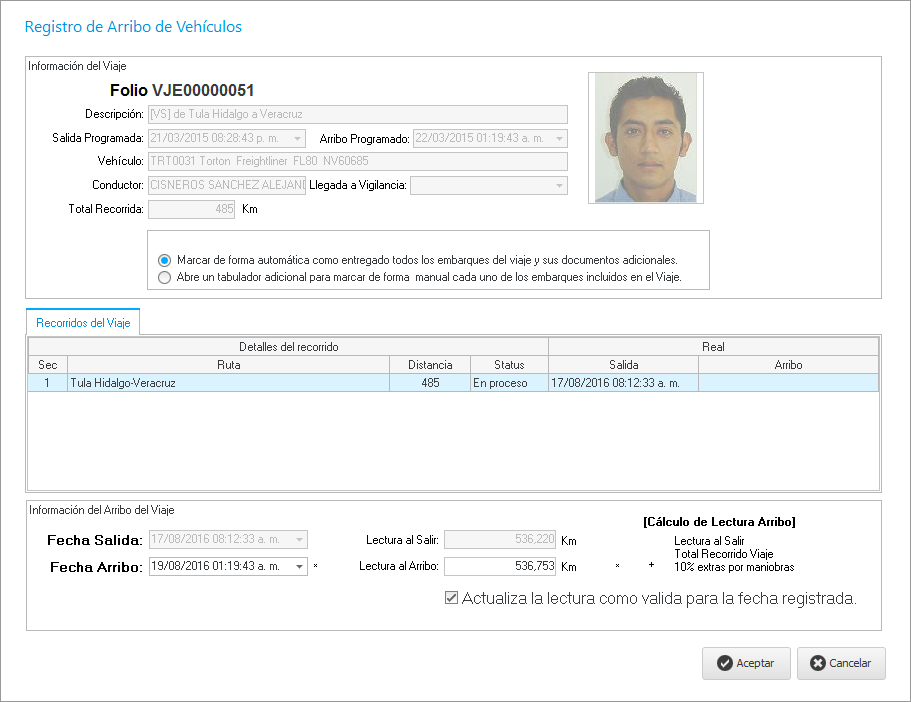 En esta malla, debemos de seleccionar el folio del viaje a dar entrada y hacendo clic en el botón para abrir el siguiente asistente en donde ingresaremos la fecha de arribo, la lectura del medidor y podemos elegir si actualiza el registro del medidor o no.