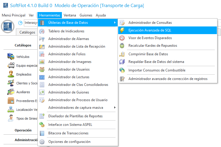 Aquí tenemos la opción de realizar modificaciones directamente en la base de datos a través de Sentencias de SQL, Query. Para abrir esta opción, debemos de ir al menú [Herramientas \ Utilerías de Base de Datos \ Ejecución Avanzada de SQL].