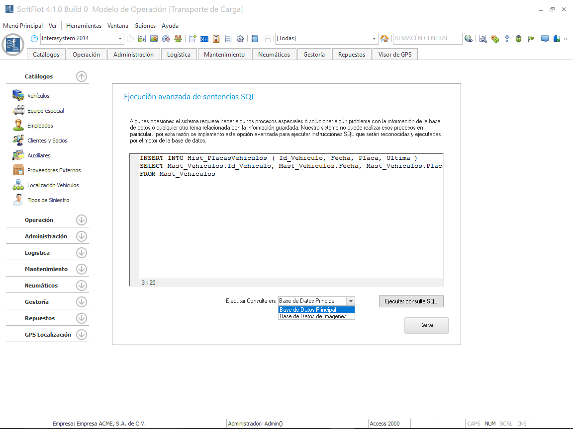 Al hacer clic nos muestra la siguiente ventana en donde ingresaremos nuestras consultas que deseamos realizar y podemos seleccionar si deseamos realizar el cambio en la base de datos principal o en la de imágenes.