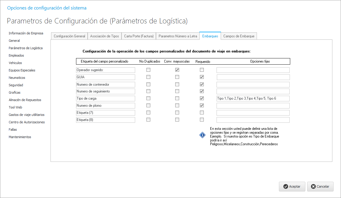 En esta sección, podemos configurar las etiquetas de los campos personalizados al momento de generar un Embarque, de igual manera podemos hacerlos requeridos para evitar generar estos embarques sin antes definir Tipo de carga o Guía por ejemplo.