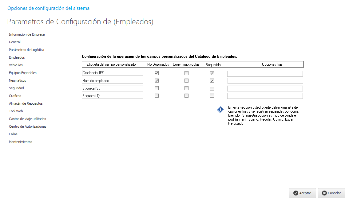 En esta pestaña definimos las características de los cuatro campos personalizables con los que cuenta el módulo de