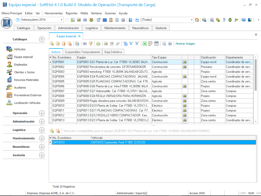 Una vez ingresado el equipo, podemos definir la compatibilidad del equipo con un vehículo para posteriormente tener la posibilidad de montar el equipo especial al vehículo. Para ello debemos de dar clic en el botón en el segundo segmento de la malla principal.