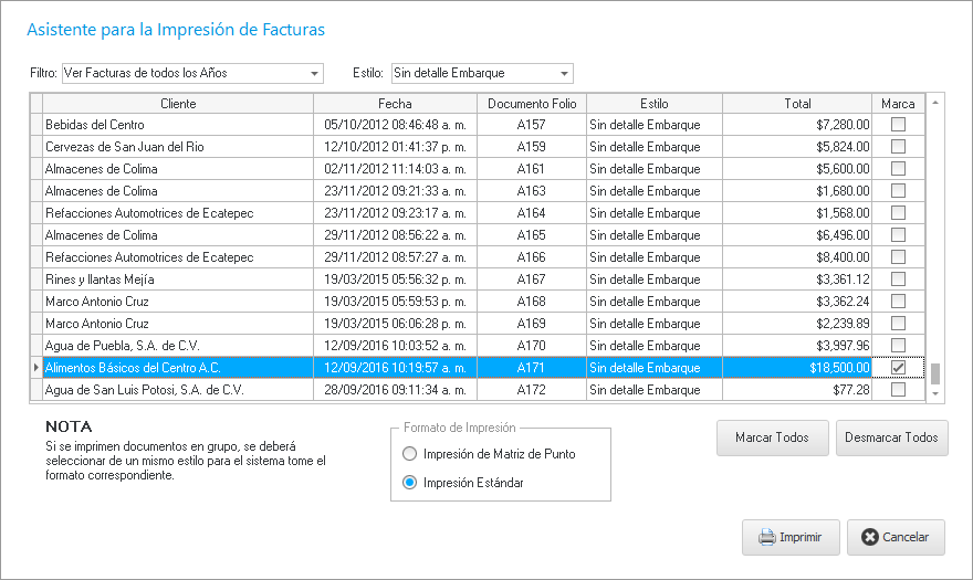 Al hacer clic nos muestra la siguiente ventana en la cual seleccionaremos la factura a imprimir.