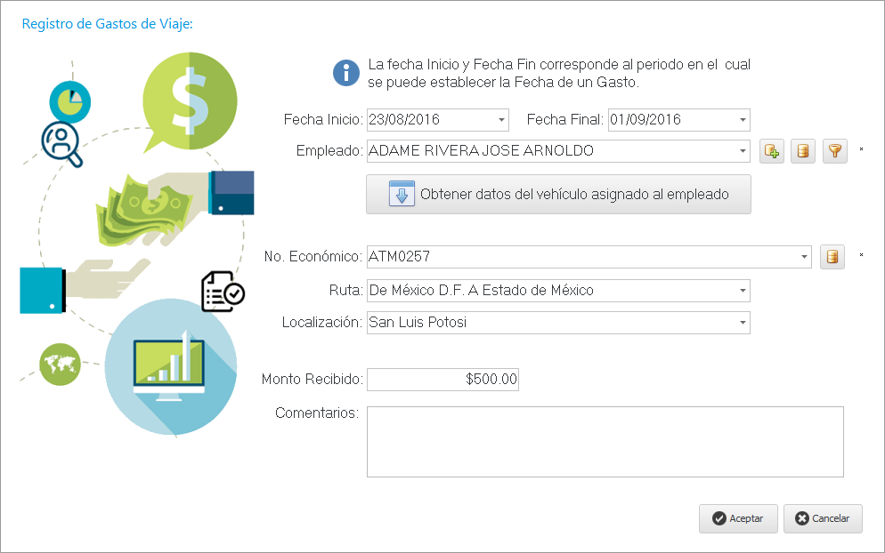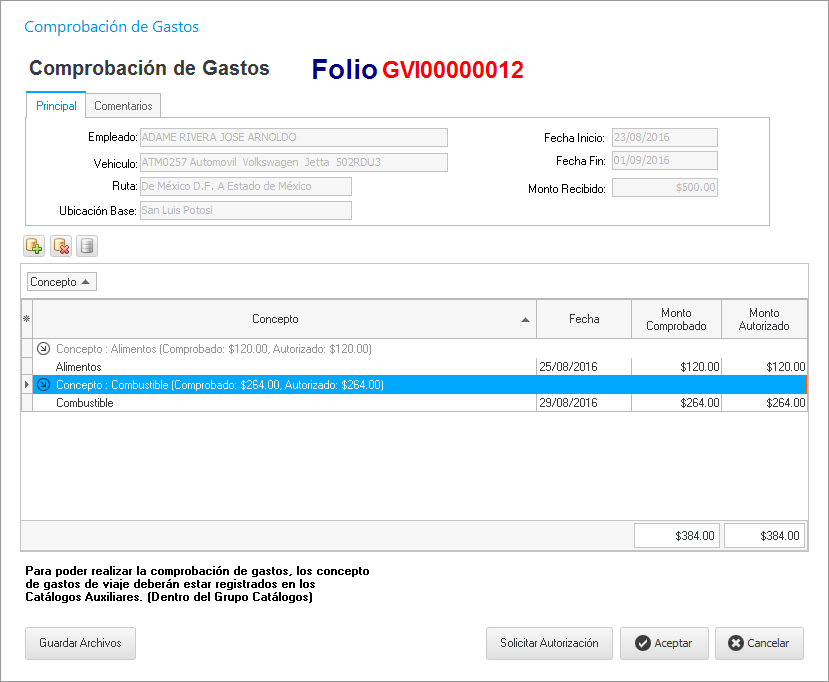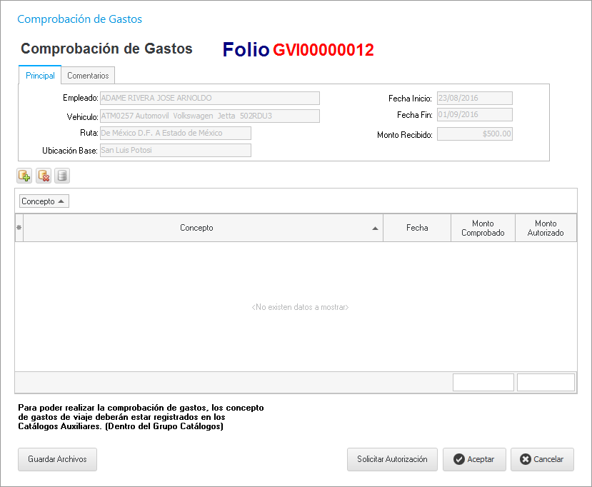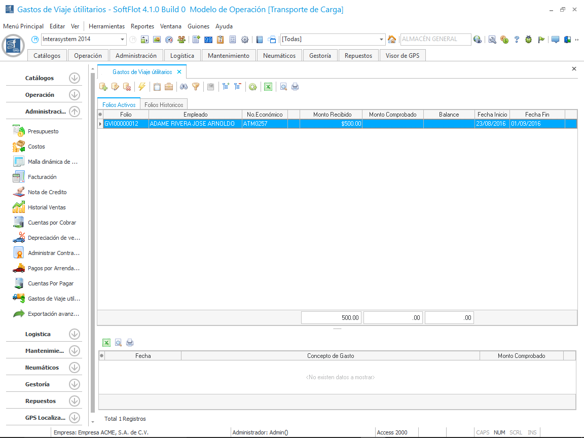 Cada vez que un empleado realiza un viaje ya sea dentro o fuera de la región recibe una determinada cantidad, nunca se puede asegurar cuanto se va a gastar un conductor en un viaje, por lo que a su regreso se realiza una comprobación de gastos para verificar todos los gastos que tuvo que hacer en el transcurso del viaje. Veamos más claramente como se registra un gasto de viaje en el sistema.