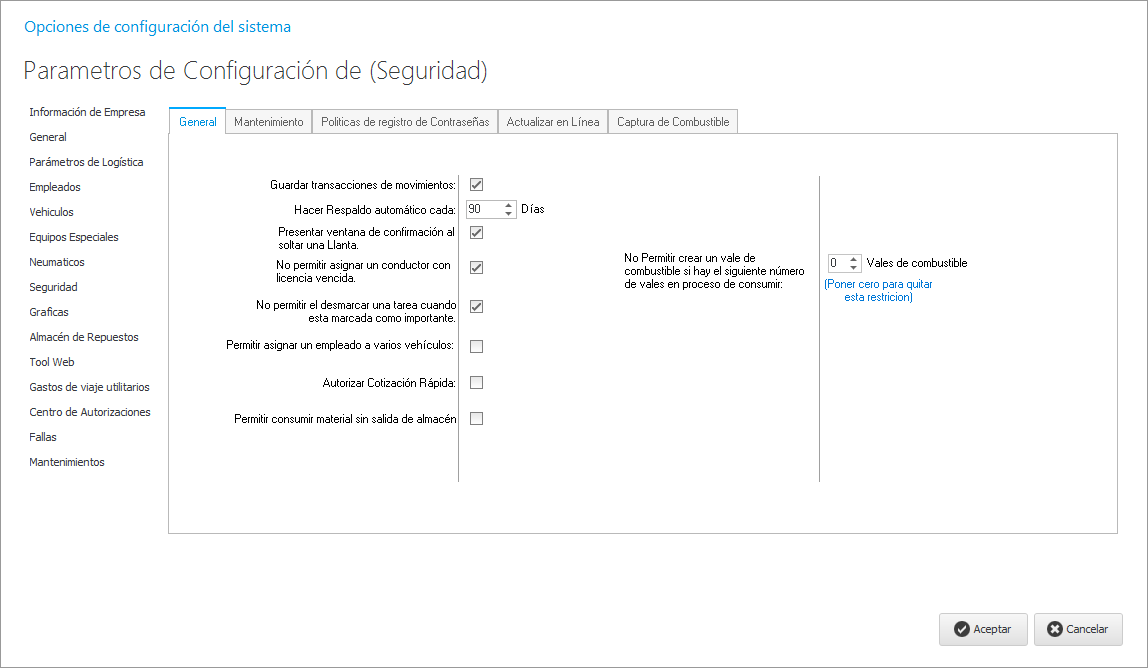 En esta pestaña podemos configurar la posibilidad de realizar o no ciertos movimientos en varios módulos del SoftFlot como la programación de los respaldos (solo funciona en Access), guardar transacciones de movimiento, etc.
