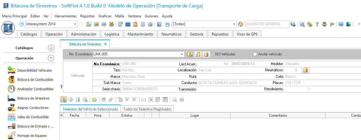 Para agregar un nuevo siniestro básico, primero seleccione el vehículo en la sección y posteriormente de clic en el botónpara abrir el asistente como lo muestra la imagen.