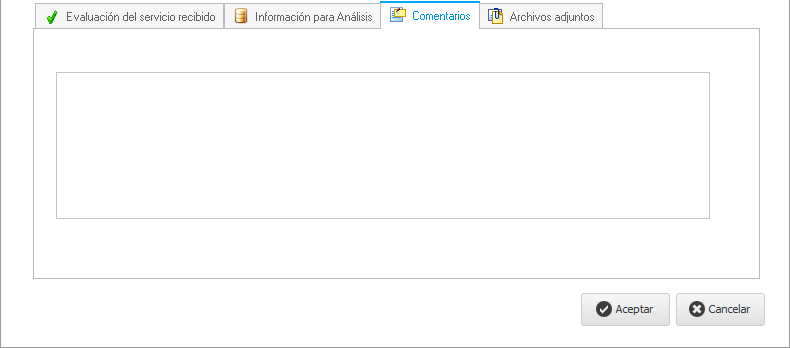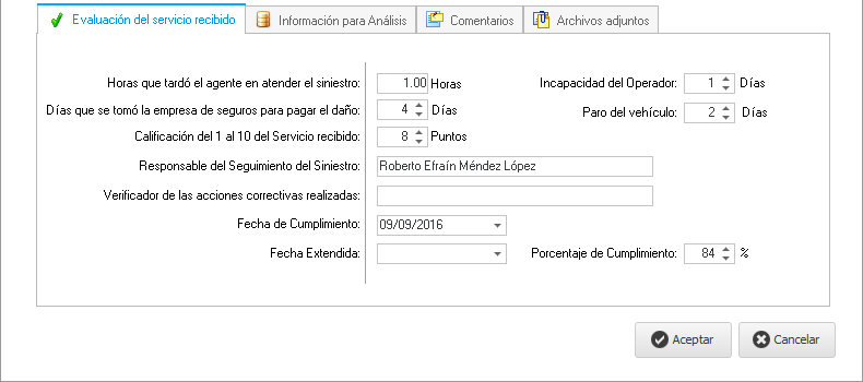 En esta parte, como lo dice la pestaña, evaluaremos el servicio recibido por la aseguradora; en la siguiente imagen podemos ver la información que podemos capturar para calificar esta atención.