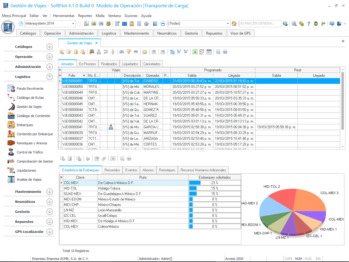 Logística es donde los usuarios registran todo lo que tenga que ver con la transportación de cualquier tipo de producto de un lugar a otro, cobrando un flete al cliente por este servicio, el inicio del proceso esta en la creación de una Ruta, esta contiene la información principal como es (Clave, Origen, Destino, Tarifa e información de gastos adicionales del viaje) también en la ruta podemos personalizar cada concepto en la tarifa, asociándolo con un cliente y así crear lo que se llama convenios. Ya creada la ruta, podemos iniciar nuestro proceso de logística.