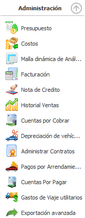 Tenemos un módulo complemento de venta por separado para administrar los contratos ya sean arrendamiento o préstamo de vehículos o equipo. Nuestras cuentas por pagar de ordenes de servicio y algunas que se irán añadiendo, así como los controles de gastos al operador de la unidad.