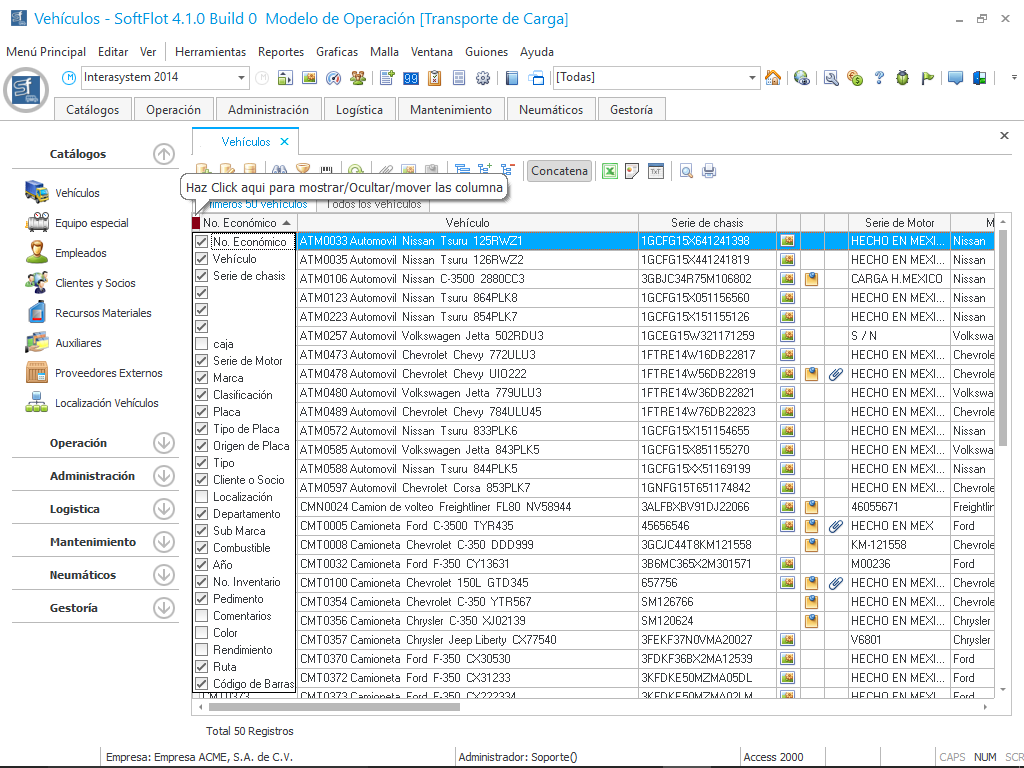 Dentro del SoftFlot4 contamos con las siguientes herramientas para modificar las mallas y que nos muestren la información más importante para nosotros. En la siguiente imagen se muestra como agregar o quitar columnas en nuestra malla de datos