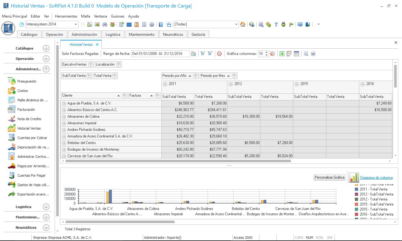 Histórico de ventas por concepto de transporte, es decir todos los viajes facturados a nuestros diferentes clientes en un filtro de fecha y con la posibilidad de presentar diferentes conceptos de agrupamiento, esto nos dará gran visibilidad de la información y con el acomodo que necesitemos; todo ello exportable a diferentes formatos como son excel, pdf, html, txt.