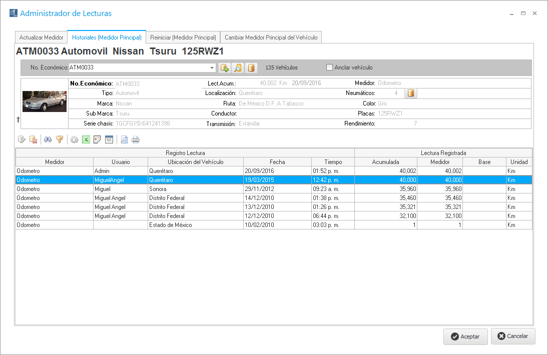 En esta pestaña podemos modificar el historial de lecturas de tal manera que, si cometimos un error al actualizar una lectura ya sea por medio de una carga de combustible, al realizar un viaje o incluso por esta herramienta; podemos modificar o eliminar los registros realizados.