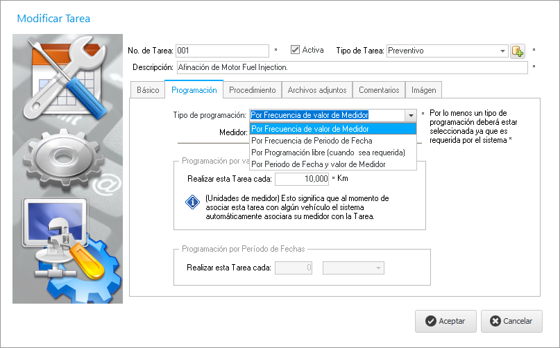 ![]() Y estas, a su vez, deben de crearse en base al tipo de medidor que utilice (Odómetro, Hubodómetro, Horómetro, No utiliza).