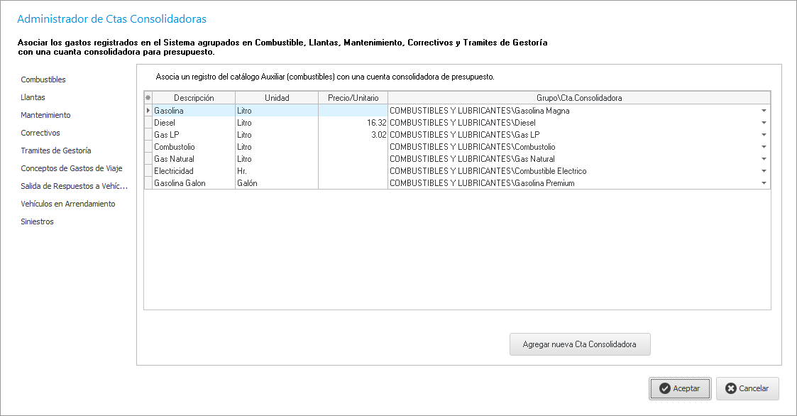 Al final, debemos de crear Grupos y Cuentas de Consolidación para cada tipo de movimiento que deseamos directamente en el Catálogo de Auxiliares o en el Administrador de cuentas de Consolidadoras. Estas cuentas se asocian en esta ventana: