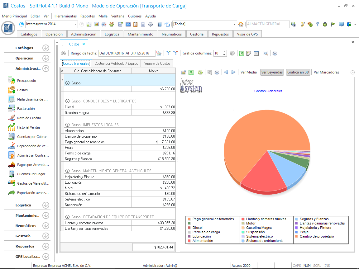 ![]() En donde cada descripción es un concepto generado en Auxiliares, por ejemplo: los auxiliares de un vehículo pueden ser Tipo de combustible, Tipo de vehículo; e incluso podemos asociar estas cuentas a las tareas de mantenimiento y fallas reportadas. De esta manera podemos llevar un control de gasto por concepto o grupo en el módulo de Costos.