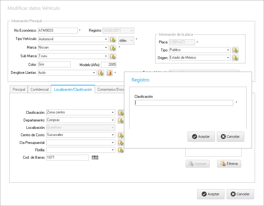 Podemos agregar los auxiliares y centros de costos de dos maneras, la primera sería directamente en el módulo Auxiliares; y la otra es al momento de realizar un registro en cualquier módulo, por ejemplo en el Catálogo de Vehículos como se muestra en la imagen al hacer clic en el botón