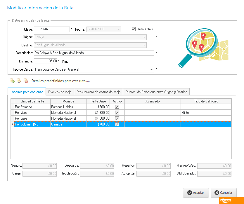 Lo primero que debemos de realizar es crear las rutas en el Catálogo de Rutas, esto nos permite definir los costos de viaje debido a que podemos definir una o más unidades de tarifa como por ejemplo: