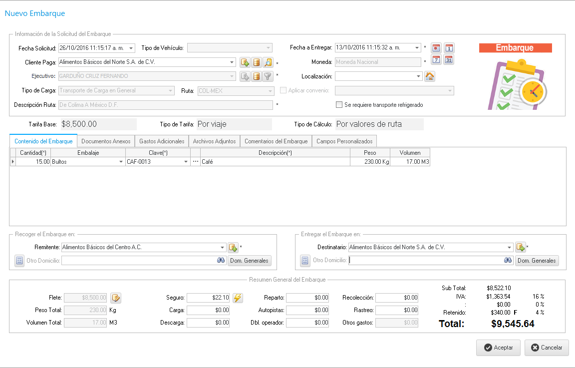 Adicionalmente podemos definir remitente y destinatario, definidos en Clientes y Socios, y gastos adicionales como paquetería, demoras, carga, descarga, etc; y estas pueden ser aplicadas al embarque o a la factura.