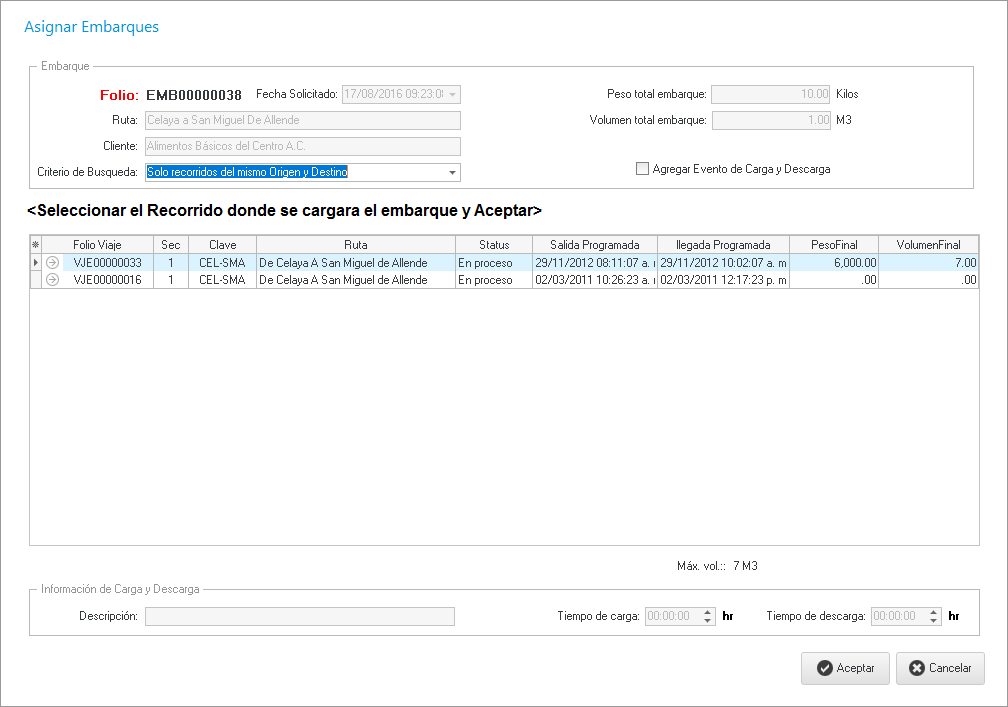 Para realizar esto, debemos de ir nuevamente al módulo de Embarques y haciendo clic en el botón nos muestra la ventana en donde aparecen todos los viajes con la misma ruta que el embarque.