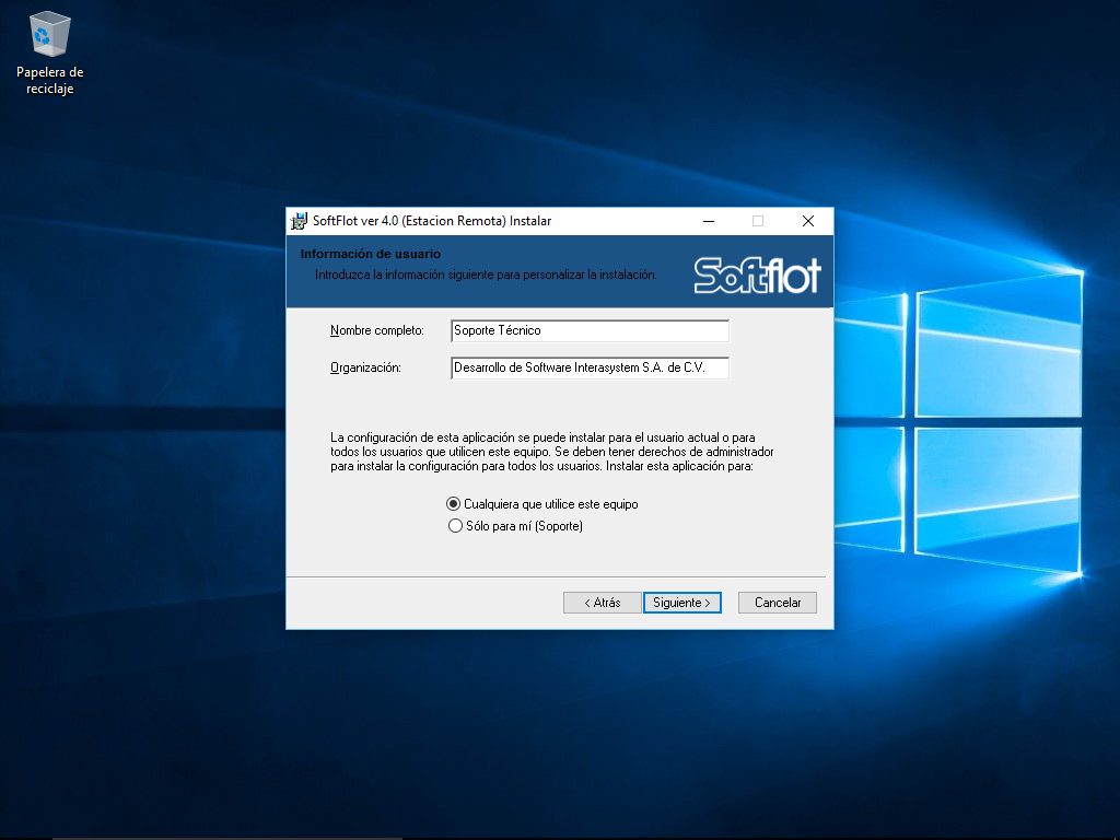 En esta ventana ingresamos el nombre de la persona que utilizará el SoftFlot y la organización o Empresa a la cual pertenece; además de seleccionar si todos los usuarios del equipo puedan ingresar al SoftFlot o únicamente el usuario que se encuentra instalando (esto es opcional), y damos clic en Siguiente.