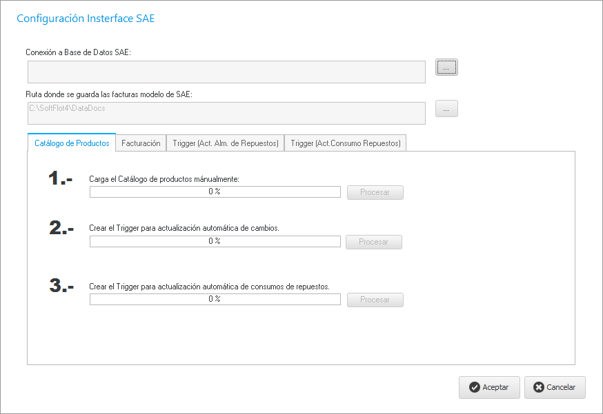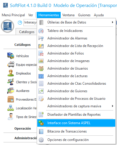 Además de poder realizar interfaces con otros sistemas, SoftFlot permite la realización de una conexión con una base de datos SAE. Para abrir esta opción, debemos de ir al menú [Herramientas \ Interface con Sistema ASPEL] como se muestra a continuación.