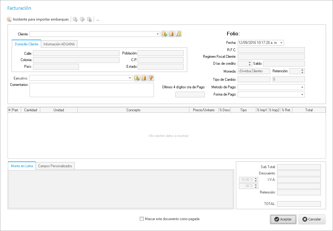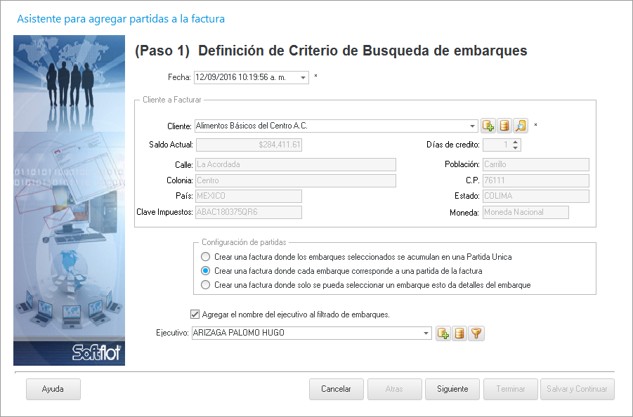 Al hacer esto nos mostrará la siguiente ventana en donde seleccionaremos el Cliente a facturar en base uno o varios embarques realizados, la configuración de las partidas de la factura y además podemos filtrar los embarques del cliente por medio del ejecutivo quien ingresó estos embarques.