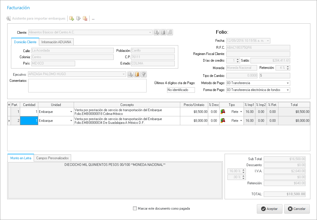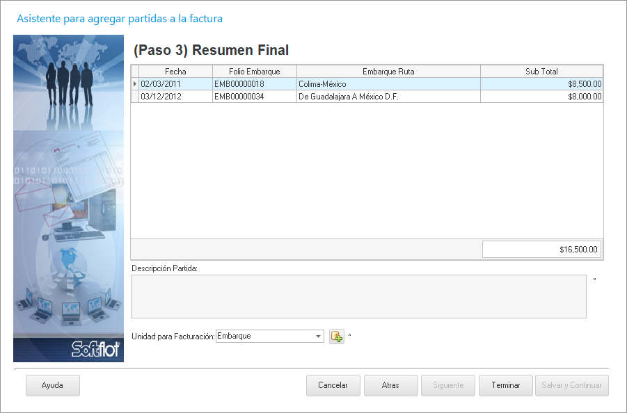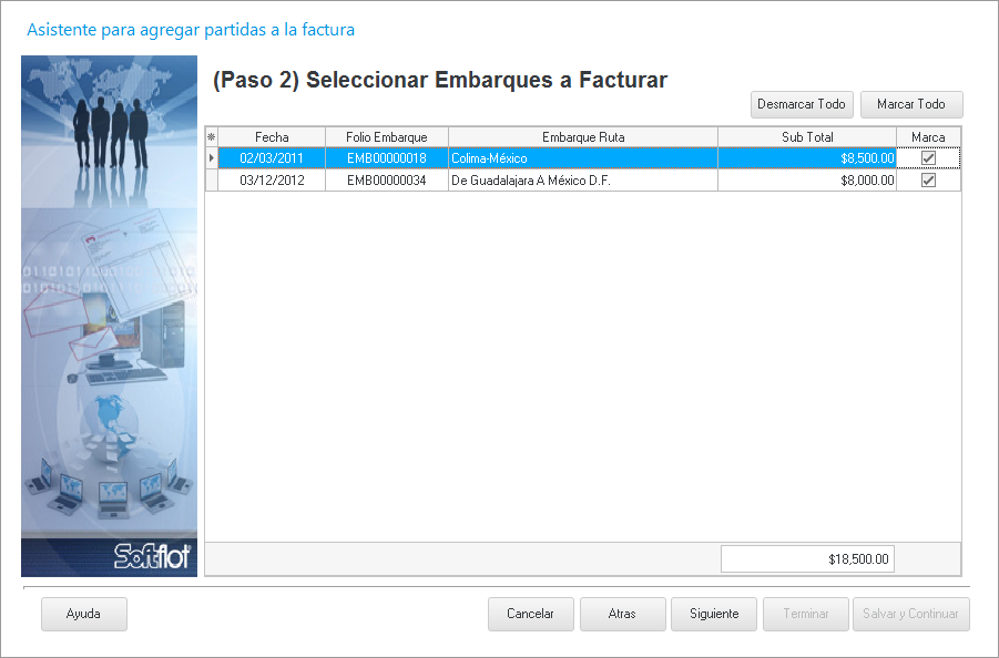 Aquí seleccionamos el o los embarques a facturar con la fecha, folio de embarque, ruta del embarque y el sub total respectivamente de cada embarque.