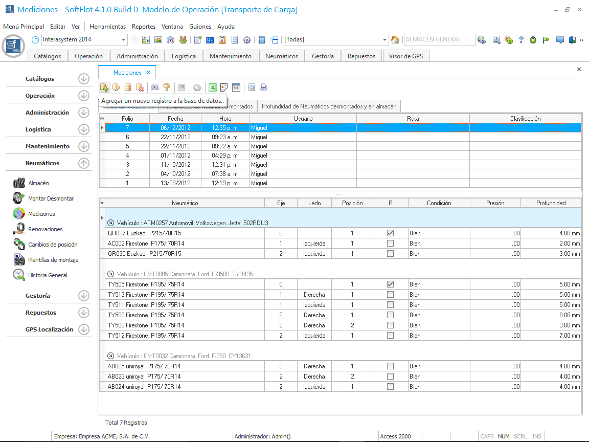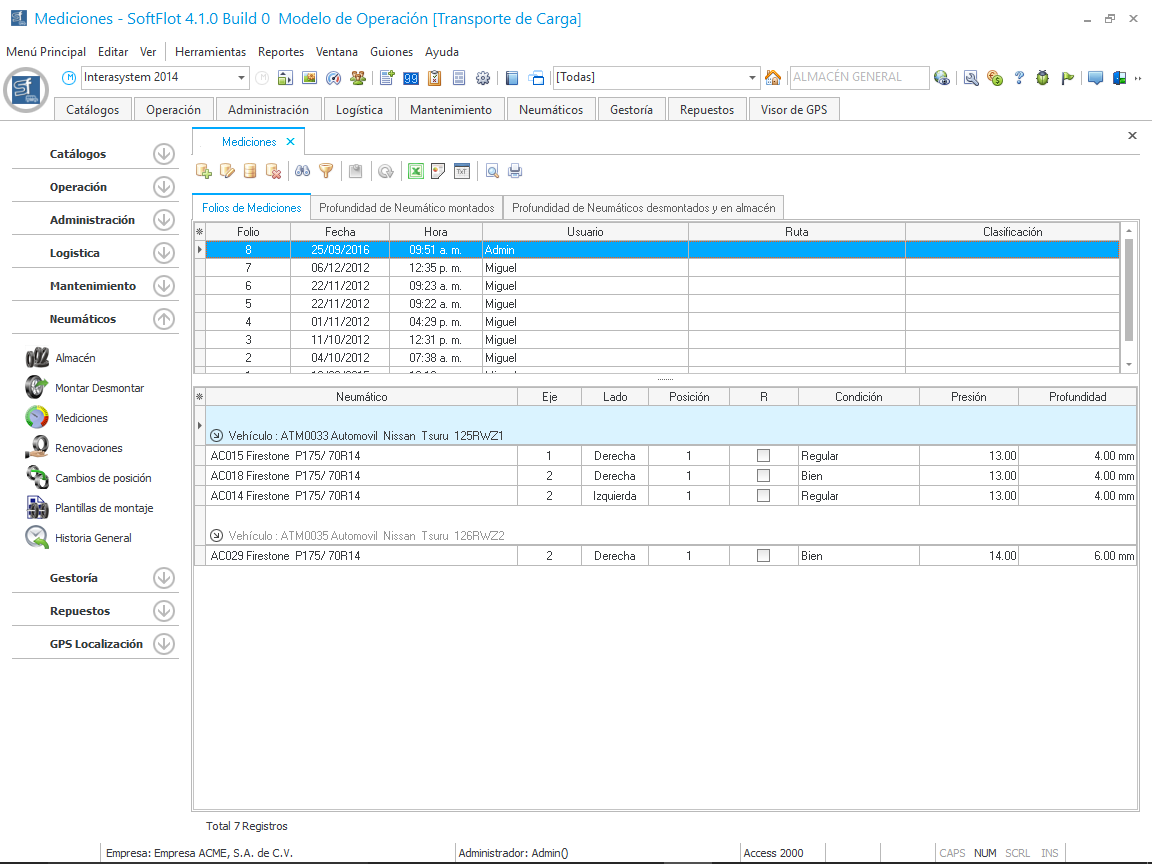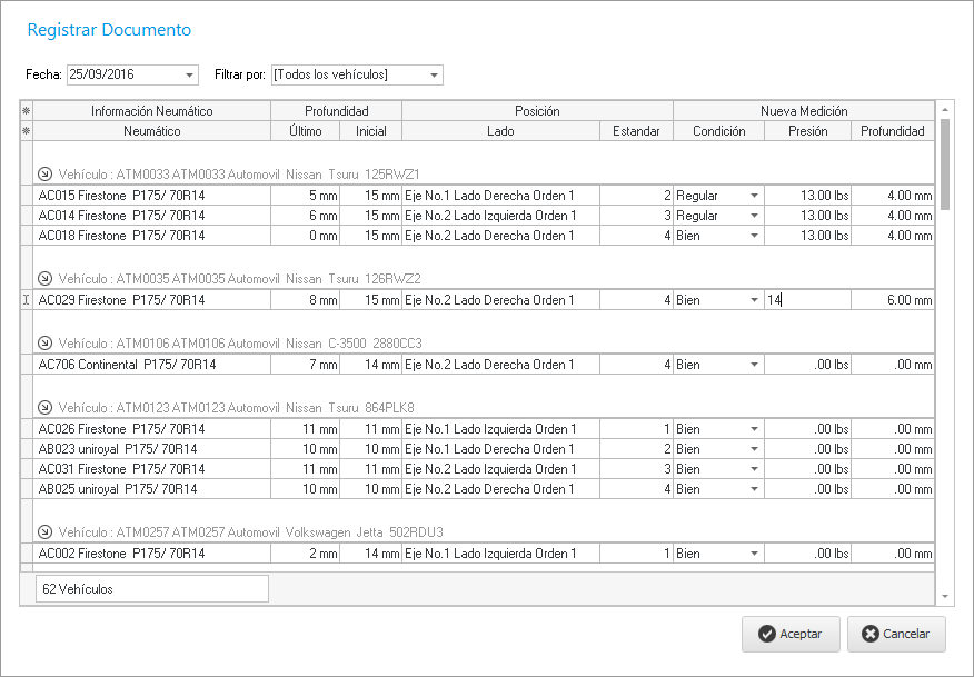 Para poder controlar los mínimos espesores recomendados es necesario poder llevar mediciones periódicas de estas, el sistema ofrece el método correcto para registrarlas y después poder valorarlas y emitir mensajes de precaución al usuario y ordenes de desmontaje, esto con el propósito de mantener una seguridad en el estado de nuestros Neumáticos.