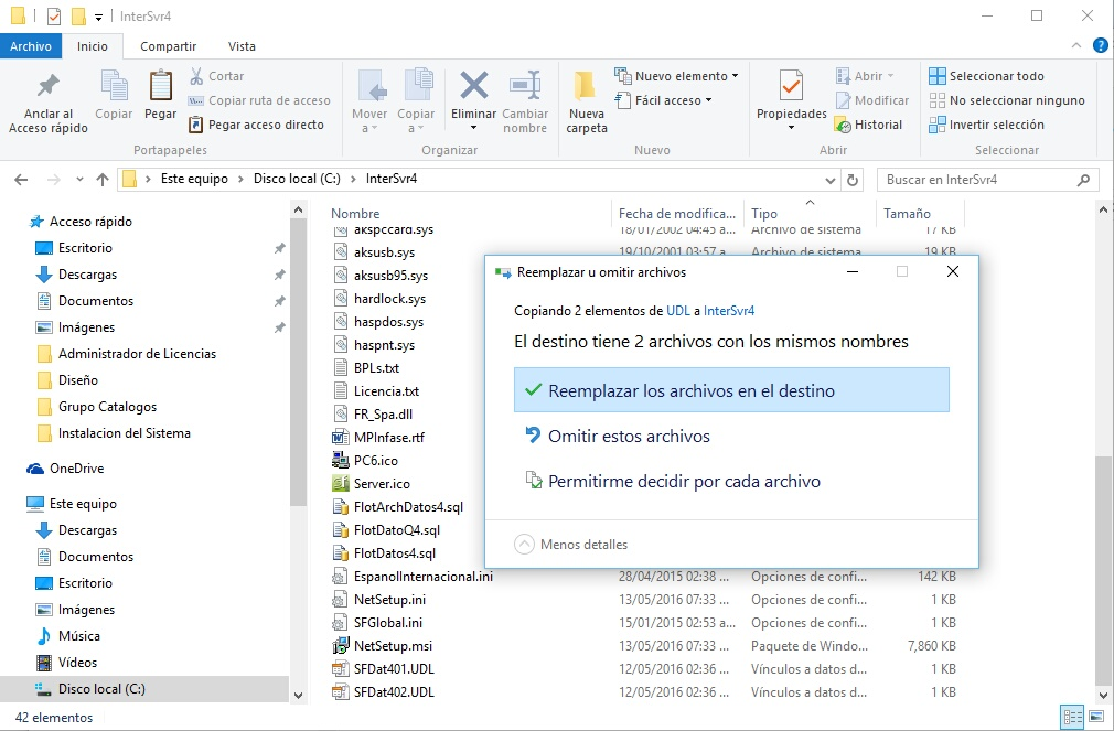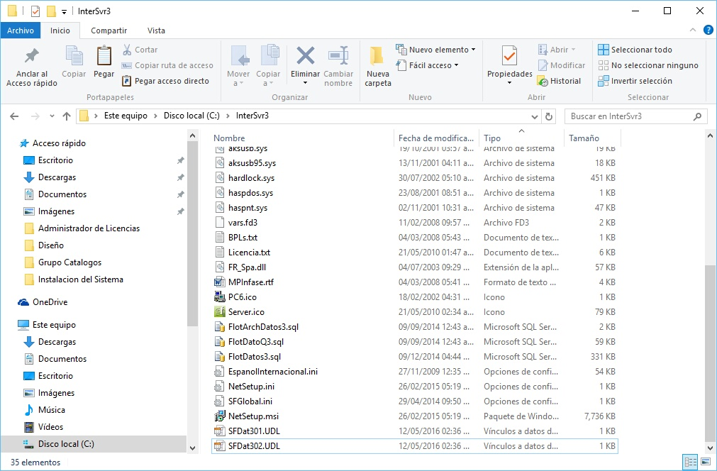 De igual manera que en Access, Modificamos el nombre de los archivos a SFDat401.UDL y SFDat402.UDL respectivamente y los reemplazamos con los archivos de la carpeta InterSvr4 si es que se encuentran, en todo caso sólo movemos los archivos a la carpeta.