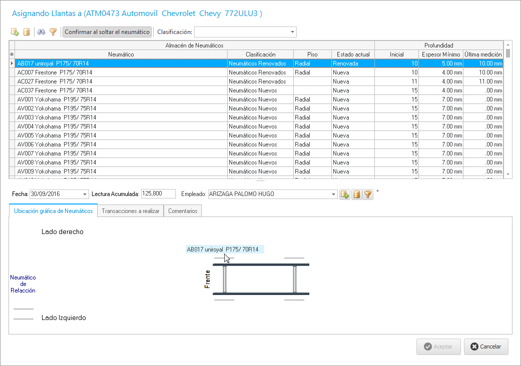 Al hacer clic en si, nos muestra el neumático montado en el vehículo y el registro en la pestaña como se muestra en la siguiente imagen.