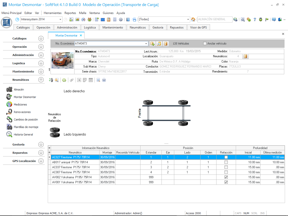En este módulo se lleva a cabo el montaje y desmontaje de Neumáticos a cada vehículo de la flotilla, para montar un Neumático debemos de seleccionar un vehículo en la sección , al seleccionarlo nos muestra la plantilla de la estructura y los ejes del vehículo, además nos muestra si tenemos la posibilidad de asignar neumáticos de repuestos.