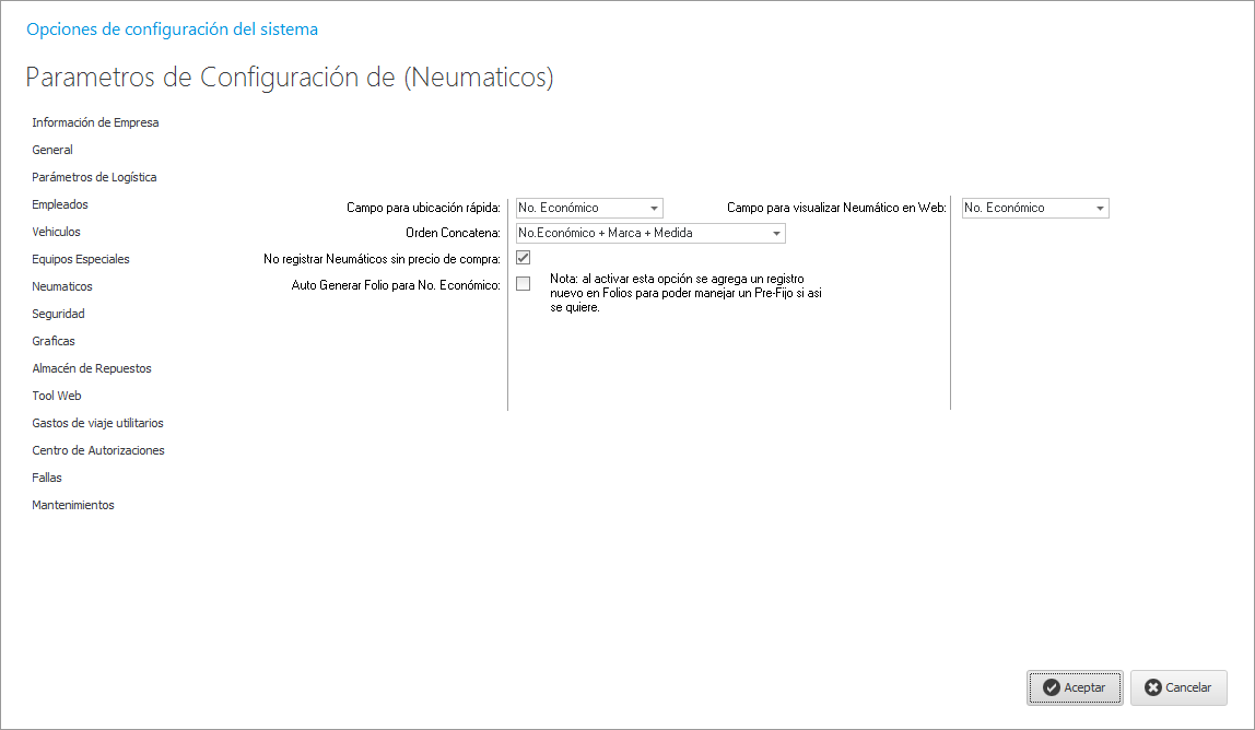 Además la manera como concatena la información del neumático, si genera folios automáticamente y el campo para visualizar en Web (ToolWeb). Para evitar generar costos al dar de alta los neumáticos que ya tienen montados los vehículos al comprarlos, quitamos la marca en la opción correspondiente para darlos de alta y después la volvemos a marcar para generar estos costos por neumáticos.