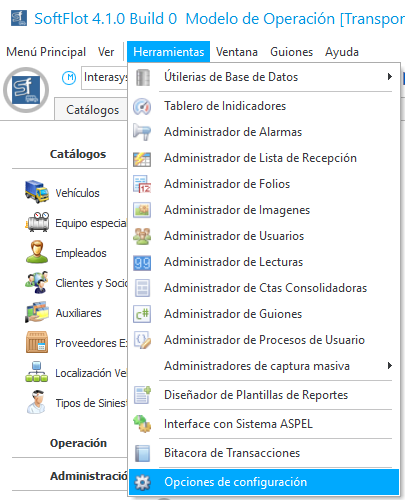 En esta sección realizaremos todas las configuraciones que el sistema necesita para el buen funcionamiento de acuerdo a nuestra operación. Para abrir esta opción, debemos de ir al menú [Herramientas \ Opciones de configuración] como se muestra a continuación.