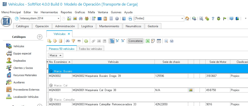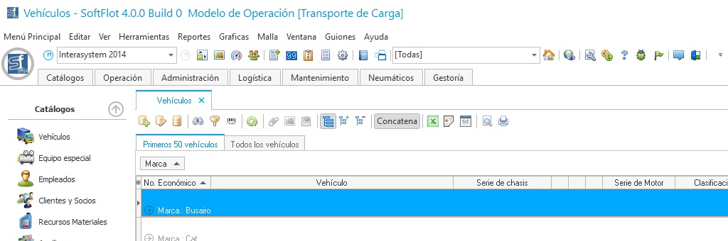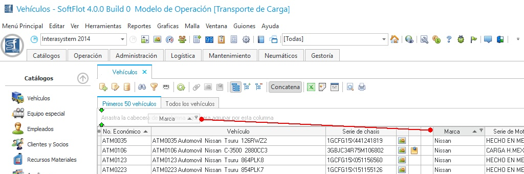 El sistema posee una función capaz de mostrar la información agrupada por algún campo seleccionado, como ejemplo, de esto, si desea agrupar nuestro catálogo de vehículos por el tipo de marca, se pudiera hacer de la siguiente forma: En la pantalla principal de vehículos oprimir el botón de Activar la barra de agrupar, este quedará sumido indicando el estado actual agrupado. Después podemos desplazar las columnas al siguiente campo para Agrupar la información en base a este campo.