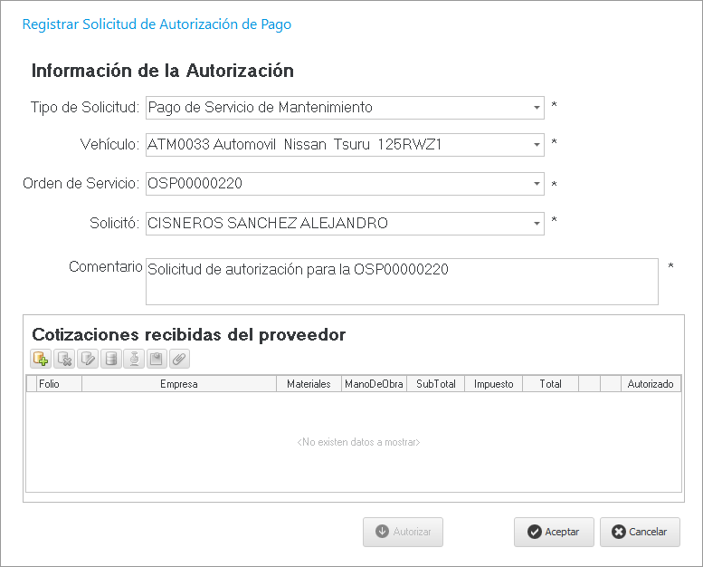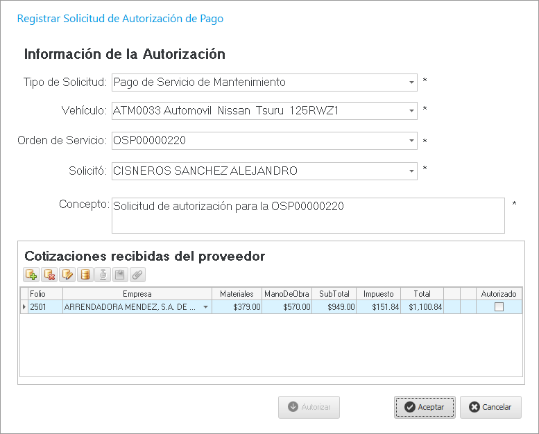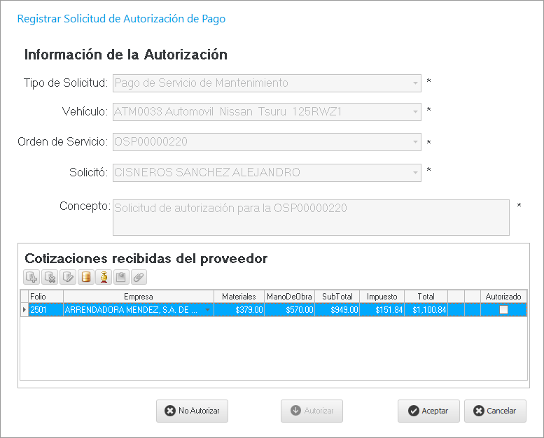 el cual nos abrirá la misma ventana pero con las opciones de edición deshabilitadas y la de autorizar habilitada como se muestra en la siguiente imagen.
