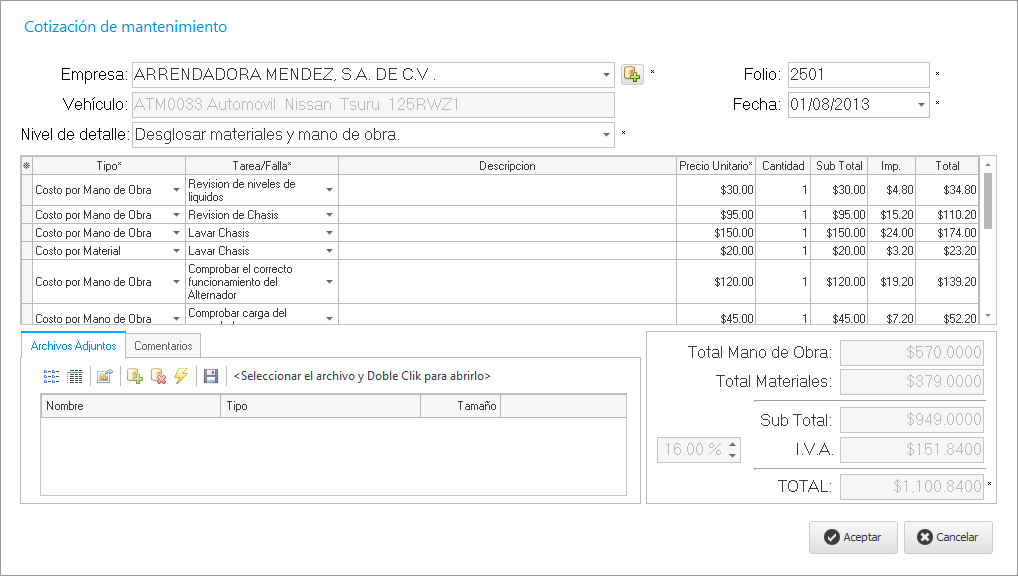 Como puede ver, el "Precio Mano de Obra" como el "Precio Materiales", los maneja en registros separados y aplica el I.V.A. definido en el sistema a diferencia del folio de la OSP. Al dar clic en Aceptar, veremos un registro en nuestro formulario el cual resume los costos generados por la OSP, en este caso.
