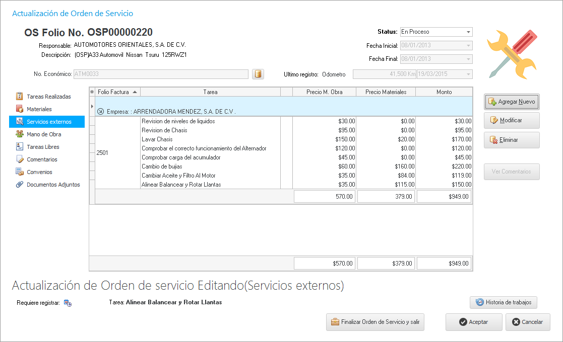 del formulario para abrir una ventana en donde ingresaremos los conceptos de la orden de servicio, el proveedor del servicio y los gastos generados por estos conceptos. Al ingresar los datos deberán ser algo parecido a esto.