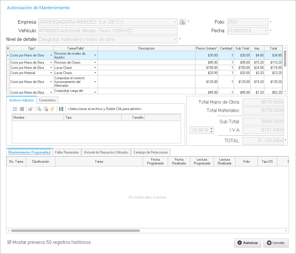 del formulario, donde veremos las tareas y sus costos generados previamente ingresados; además de información del vehículo como mantenimientos programables, fallas reportadas, historial de repuestos utilizados y el catálogo de repuestos.