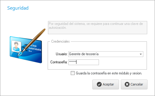Al dar clic en Autorizar, nos preguntará si estamos seguros de realizar este movimiento, seleccionamos Si y abre una ventana en la cual nos pedirá seleccionar al encargado de autorizar estas solicitudes y su contraseña.